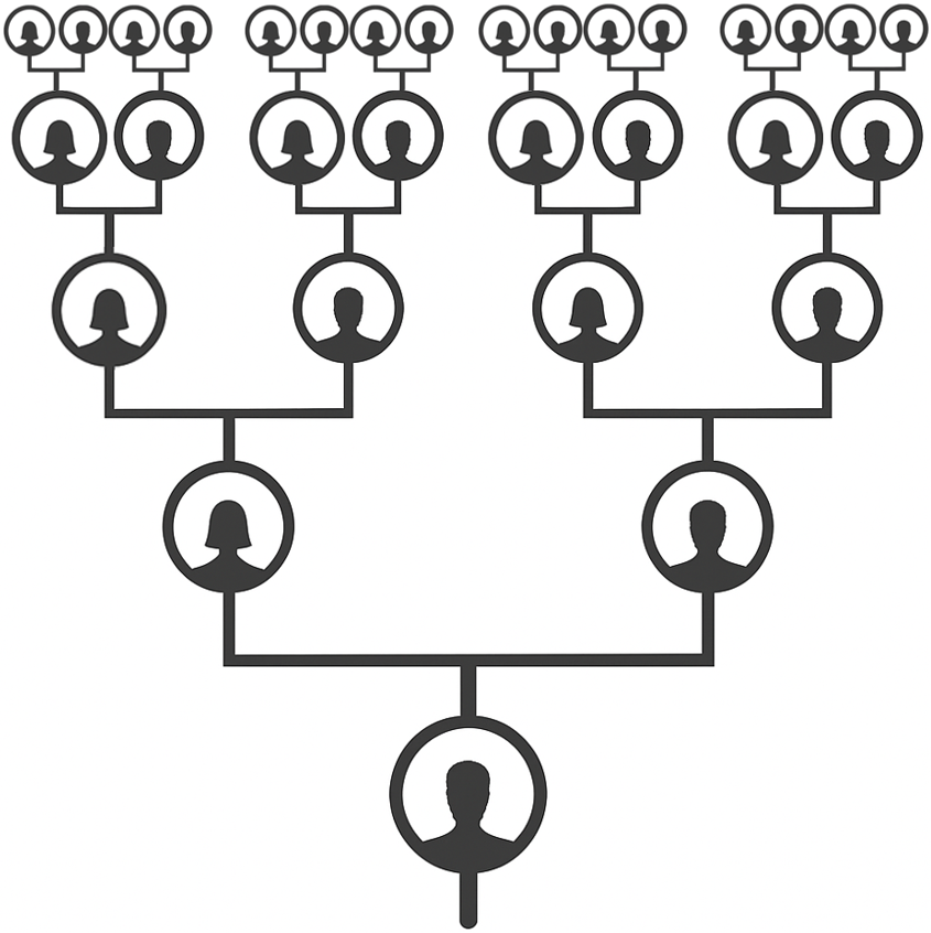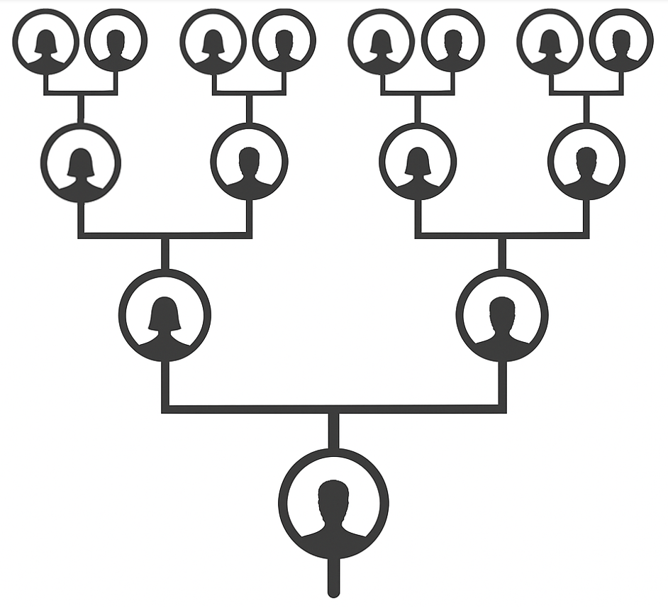 An ancestral chart stretching back three to seven generations from the client